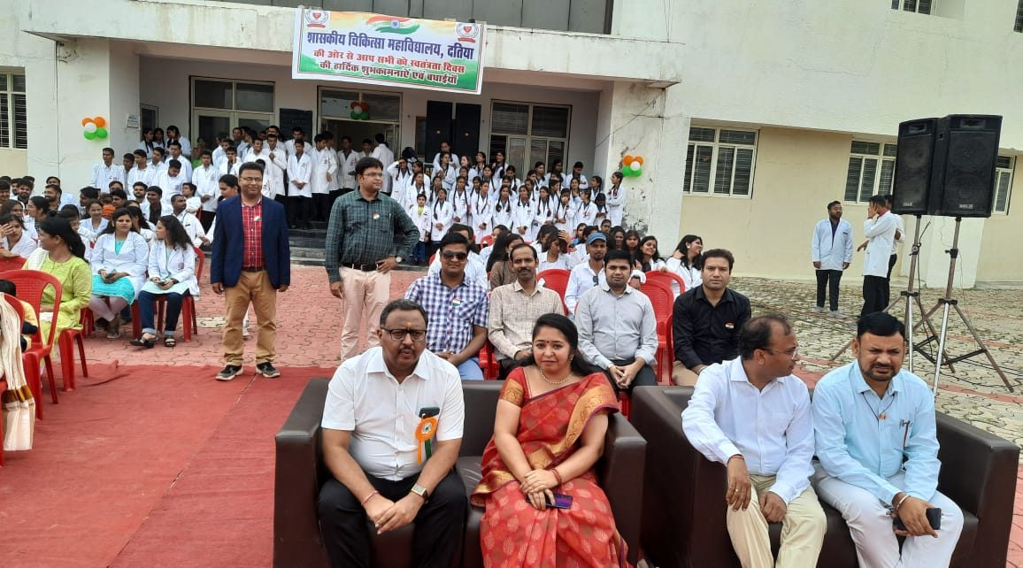दतिया/ चिकित्सा महाविद्यालय दतिया में मेडिकल डीन डा. दिनेश उदैनियाँ के द्वारा ध्वजारोहण किया गया, एवं बुंदेलखंड की भूमि को वीर शहीदों की भूमि बताते हुए, रानी लक्ष्मीबाई के अविस्मरणीय बलिदान का उदाहरण दिया!डा . उदैनियाँ के कार्यकाल में मेडिकल कॉलेज की उपलब्धियों का जिक्र विभिन्न चिकित्सा शिक्षकों एवं छात्रों द्वारा किया गया जिसमें सार्वाधिक 46 एमडी/एमएस सीट की मान्यता, मेडिकल कॉलेज का एनएमसी द्वारा रिकॉग्निशन, 50 बिस्तर के क्रिटिकल केयर ब्लॉक का निर्माण, अधिकारियों एवं कर्मचारियों के 150 आवास की स्वीकृति, छात्र छात्राओं के लिए 300 बेड हॉस्टल की स्वीकृति, सर्व सुविधायुक्त कैंटीन निर्माण, एवं चिकित्सकों की भर्तियां प्रमुख है ! इस अवसर पर डा.प्रदीप शुक्ला, मेडिकल अधीक्षक डा.कृष्णा कुलदीप, डा.श्वेता यादव, डा.कपिल देव आर्य एवं डा. मुकेश शर्मा द्वारा अपना संबोधन प्रस्तुत किया गया! स्वतंत्रता दिवस के कार्यक्रम में चिकित्सा छात्रों ने उत्साह के साथ भाग लिया एवं अनेक देश भक्ति से ओत प्रोत प्रस्तुति दीं! इस अवसर पर डा. अर्जुन सिंह, डा . के एन आर्या,डा. पहराम अधिकारी, डा. अनिल मंगेशकर, डा. लक्ष्मण सिंह, डा. अभिषेक शर्मा, डा. संजीव शर्मा, डा. पुनीत अग्रवाल, डा. अपूर्व त्रिपाठी, नर्सिंग ऑफिसर्स, चिकित्सा छात्र एवं हॉस्पिटल स्टॉफ मौजूद रहा !
