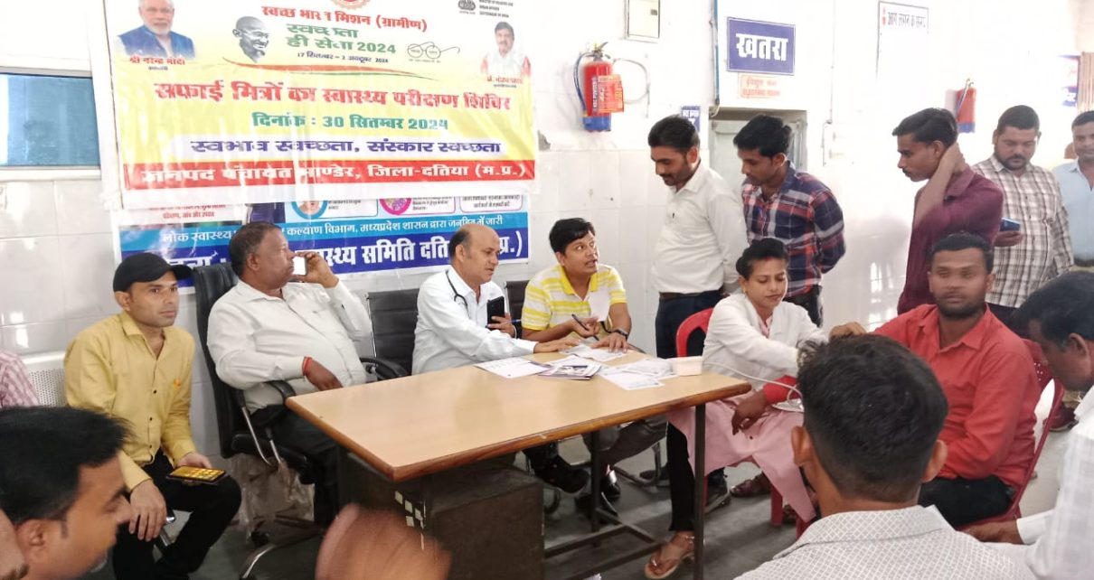 दतिया।शासन के निर्देशानुसार पूरे मध्य प्रदेश में 17 सितम्बर से 2 अक्टूबरतक स्वभाव- स्वच्छता-संस्कार स्वच्छता की थीम पर स्वच्छता ही सेवा अभियान अभियान चलाया जा रहा है।अभियान के अंतर्गत आज सोमवार को सामुदायिक स्वास्थ्य केन्द्र भाण्डेर में सफाई मित्रों के स्वास्थ्य परीक्षण शिविर का आयेाजन किया गया है।शिविर में मुख्य कार्यपालन अधिकारी जनपद पंचायत भाण्डेर एमएस सयैम ने जानकारी देते हुए बताया कि सफाई मित्र स्वच्छता के सच्चे सिपाही है, जो ग्राम में स्वच्छता की अलक जगा रहे है। स्वस्थ शरीर में स्वस्थ्य मन रहता है। प्रत्येक व्यक्ति को अपने स्वास्थ्य का पूर्ण ध्यान रखना चाहिए। शिविर में खंड चिकित्सा एवं स्वास्थ्य अधिकारी भाण्डेर डॉ. आरएस परिहार ने बताया कि प्रत्येक व्यक्ति को अपने आहार में संतुलित भोजन लेना चाहिए एवं समय-समय पर अपना स्वास्थ्य परीक्षण करना चाहिए।