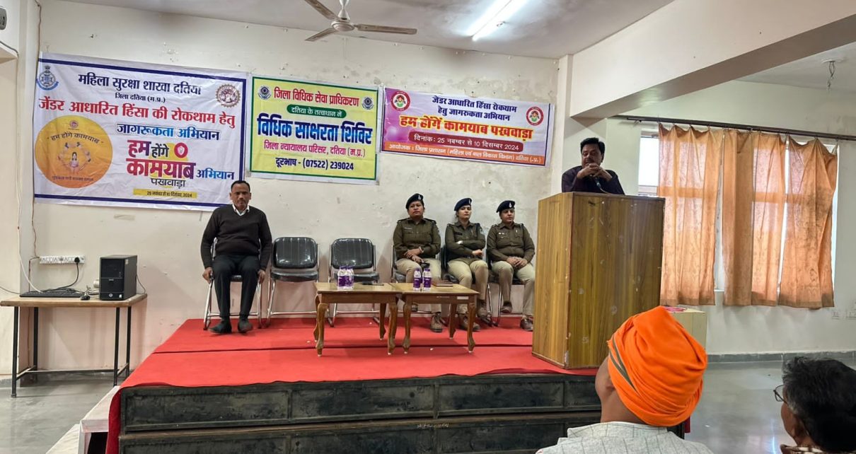 दतिया।शासन द्वारा जारी निर्देशों के पालन में एवं कलेक्टर संदीप कुमार माकिन के निर्देशन में आज रावतपुरा कॉलेज दतिया के सभाकक्ष में जिला विधिक सेवा, पुलिस विभाग, पंचायत विभाग एवं महिला एवं बाल विकास विभाग के समन्वय से घरेलू हिंसा से महिलाओं की सुरक्षा अधिनियम पर संवाद एवं वन स्टॉप सेंटर ऊर्जा डेस्क, घरेलू हिंसा आदि के संबध में कार्यक्रम का आयोजन किया गया। कार्यक्रम में जिला विधिक सेवा प्राधिकरण से जिला जज विवेक शिवहरे, अतिरिक्त मुख्य कार्यपालन अधिकारी जिला पंचायत धनंजय मिश्रा, जिला कार्यक्रम अधिकारी महिला एवं विकास विभाग अरविंद उपाध्याय, मिश्रा, महिला थाना प्रभारी मोनिका मिश्रा,एस आई रिचा दंडौतिया, महिला एवं बाल विकास से बाल संरक्षण अधिकारी धीर सिंह कुशवाह राजीव चौवे, घनश्याम राजपूत प्रमुख रूप से मौजूद रहे।कार्यक्रम के प्रारंभ में बाल संरक्षण अधिकारी धीर सिंह कुशवाह ने उपस्थित प्रतिभागियों को अभियान के तहत आयोजित की जाने वाली गतिविधियों के बारे में जानकारी दी। उन्होंने बताया कि शासन द्वारा बेटियों और महिलाओं के सशक्तिकरण हेतु विभिन्न कानूनों एवं योजनाओं का संचालन किया जा रहा है। घरेलू हिंसा से महिलाओं की सुरक्षा अधिनियम पर चर्चा करते हुए कहा कि यहअधिनियम कुटिुम्ब में एक ही क्षत के नीचे निवासरत किसी महिला या बालिका के साथ यदि किसी प्रकार की हिंसा जैसे शारीरिक मानसिक, भावनात्मक एवं लैंगिग हिंसा होती है तो विभाग वन स्टाप सेंटर के माध्यम से पीडित महिला को विधिक, चिकित्सीय, पुलिस एवं परामर्श संबधी सहायता उपलब्ध कराता है। उन्होंने बताया कि परामर्श के उपरांत भी यदि पक्षकरों में समझौता नहीं होता है तब विभाग परियेाजना अधिकारी संरक्षण अधिकारी के माध्यम से पीड़ित महिला की डीआईआर तैयार कर संबधित न्यायालय में प्रस्तुत करता है। कार्यक्रम में अतिरिक्त मुख्य कार्यपालन अधिकारी जिला पंचायत धनंजय मिश्रा ने उपस्थित प्रतिभागियों को सबोधित करते हुए कहा कि विशेष जागरूकता अभियान हम होंगे कामयाव पखवाड़ा का व्यापक प्रचार-प्रसार किया जाना चाहिए। जिससे समाज में अधिक से अधिक जागरूकता लाई जा सके। महिला थाना प्रभारी मोनिका मिश्रा ने प्रतिभागियों को महिला हेल्प लाइन 181, चाइल्ड हेल्पलाइन 1098, सी-बॉक्स एवं पुलिस हेल्पलाइन 100 के बारे में जानकारी प्रदान की। पुलिस विभाग की ओर से मोनिका मिश्रा ने प्रतिभागियों को बाल विवाह मुक्त भारत के संबध में शपथ दिलाई। इस अवसर पर प्रतिभागी के रूप में उपस्थित महिला सरपंच द्वारा महिला सुरक्षा के संबध में प्रतिभागियों को शपथ दिलाई गई। कार्यक्रम में जिला जज विवेक शिवहरे ने उपस्थित प्रतिभागियों को संबोधित करते हुए कहा कि 14 दिसम्बर को जिले में लोक