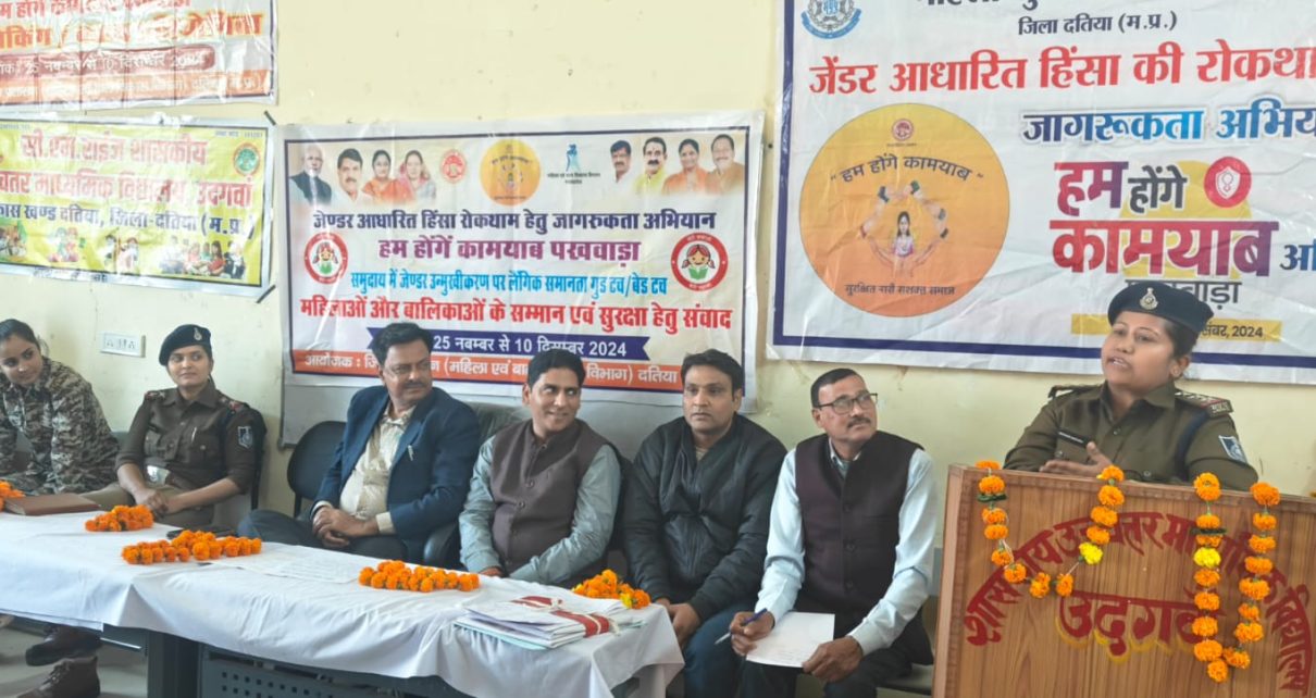 दतिया। शासन द्वारा जारी निर्देशों के पालन में एवं कलेक्टर संदीप कुमार माकिन एवं पुलिस अधीक्षक वीरेन्द्र कुमार मिश्रा के निर्देशन में विभाग द्वारा शिक्षा विभाग,गृह पुलिस विभाग, सामाजिक न्याय विभाग, पंचायत विभाग,जनसंपर्क विभाग एवं जिले के अन्य समस्त संबंधित विभागों के समन्वय से दतिया जिले में 25 नवम्बर से 10 दिसंबर 2024 तक विशेष जागरूकता अभियान ‘‘हम होंगे कामयाब‘‘ पखवाडा काआयोजन किया जा रहा है।अभियान अंतर्गत कार्यक्रमों की श्रृखला में मंगलवार को 3 सिविल लाइन नं. 1 हाई स्कूल दतिया एवं सीएम राइज उच्चतर माध्यमिक विद्यालय उदगुंवा में समुदाय में जेंडर उन्मुखीकरण विषय पर लैंगिक समानता गुड टच- बैड टच महिलाओं को सम्मान एंव सुरक्षा हेतु संवाद एवं पोस्टर मेकिंग/काव्य प्रतियोगिताओं का आयोजन किया गया।आयोजित कार्यक्रम में जिला जज विवके शिवहरे,मुख्य कार्यपालन अधिकारी जिला पंचायत कमलेश भार्गव,अतिरिक्त मुख्य कार्यपालन अधिकारी धनंजय मिश्रा,महिला एवं बाल विकास अधिकारी,महिला थाना प्रभारी श्रीमती मोनिका मिश्रा,एसआई रिचा दंडौतिया,परियोजना अधिकारी विजय पंडोलिया, प्राचार्य उमाशंकर पाठक, बाल संरक्षण अधिकार धीर सिंह कुशवाह अन्य शिक्षकगण तथा विभागों के अधिकारी एवं कर्मचारी प्रमुख रूप से उपस्थित रहे।कार्यक्रमों के प्रारंभ मे महिला थाना प्रभारी मोनिका मिश्रा ने उपस्थित प्रतिभागियों को अभियान के तहत आयोजित की जाने वाली गतिविधियों के बारे में जानकारी दी। उन्होने बतायाकि शासन द्वारा बेटियों और महिलाओं के सशक्तिकरण हेतु विभिन्न कानूनों जैसे पीसी पीएनडीटी एक्ट घरेलु हिंसा अधिनियम-2025, कार्य स्थल पर महिलाओं का यौन उत्पीडन , पॉक्सों अधिनियम एंव विभाग अंतर्गत संचालित योजनाओं के संबंध में विस्तार में बताया। श्रीमती मिश्रा ने प्रतिभागियों को महिला हेल्प लाइन 181, चाइल्ड हेल्प लाइन 1098, सी-बॉक्स एवं पुलिस हेल्प लाइन 100, वन स्टोप सेन्टर आदि के बारे में जानकारी प्रदान की।श्री उपाध्याय द्वारा बताया गया कि समुदाय में महिलाओं एवं बच्चों का स्थान अति महत्वपूर्ण है और उन्हे प्रत्येक स्तर पर समान भागीदारी का अधिकार है। लैंगिक आधार पर उनके साथ भेद भाव करना सर्वथा अनुचित है।सिविल लाइन नं. 1 हाई स्कूल दतिया में आयोजित कार्यक्रम में मौजूद जिला जज विवके शिवहरे द्वारा उपस्थित प्रतिभागियों को बाल विवाह मुक्त प्रदेश एवं महिला सम्मान एवं सुरक्षा की शपथ दिलाई गई। सीएम राइज उच्चतर माध्यमिक विद्यालय उदगुंवा में आयोजि कार्यक्रम में अतिरिक्त मुख्य कार्यपालन अधिकारी धनंजय मिश्रा ने उपस्थित प्रतिभागियों को संबोधित करते हुए कहा कि विशेष जागरूकता अभियान ‘‘हम होंगे कामयाब‘‘ पखबाडा का व्यापक प्रचार प्