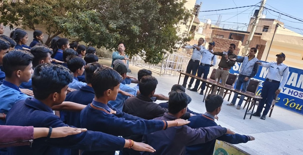 छात्र-छात्राओं को सीट बेल्ट, हेलमेट लगाने यातायात नियम पालन करने की शपथ दिलाई गई