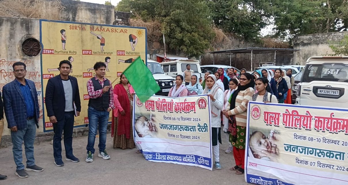दतिया।8 दिसम्बर से शुरू हो रहे पल्स पोलियो अभियान को लेकर शनिवार को जागरूकता रैली का आयोजन किया गया। रैली को कमलेश भार्गव सीईओ जिला पंचायत ने रैली को जिला मलेरिया कार्यालय परिसर से हरी झण्डी दिखाकर शहरी क्षेत्र में भ्रमण के लिए रवाना किया। पल्स पोलियो जागरूकता रैली शहर के मुख्य मार्गों से भ्रमण करती हुई, वापस जिला मलेरिया कार्यालय परिसर में पहुंचकर सम्पन्न हुई। शहर भ्रमण के दौरान एएनएम, आशा और आंगनबाड़ी कार्यकर्ताओं ने जगह-जगह लोगों से 0 से 5 वर्ष तक के बच्चों को पल्स पोलियों दवा पिलाने की अपील की।इस अवसर पर डाॅ. बी.के. वर्मा मुख्य चिकित्सा एवं स्वास्थ्य अधिकारी, डाॅ. डी.के.सोनी जिलाटीकाकरण अधिकारी,डाॅ. विशाल वर्मा शहरी नोडल अधिकारी, डाॅ. जयंत यादव मुख्य खण्ड चिकित्सा अधिकारी विकासखण्ड दतिया, डाॅ. सोमित्र बुधौलिया जिला कार्यक्रम अधिकारी, मनोज गुप्ता जिला महामारी नियंत्रण अधिकारी,अजय गुप्ता जिला लेखा अधिकारी,आशीष खरे डाटा मैनेजर टीकाकरण, सुषमा पाण्डे शहरी सुपरवाईजर, मालती राजपूत एलडीसी एमआईएस सहित एएनएम, आशा, आंगनबाड़ी कार्यकर्ता उपस्थित रहे।उल्लेखनीय है कि पल्स पोलियों अभियान के अन्तर्गत जिले में कुल 117888 बच्चों को पल्स पोलियों की खुराक पिलाई जाएगी। अभियान के सफल क्रियान्वयन के लिए कुल 1078 बूथ बनाए गए हैं। इनमें 2156 कार्यकर्ता और 105 सुपरवाईजर बच्चों को पोलियों की दवा पिलायेंगे। 11 मोबाइल टीम भी जिले में भ्रमण करेंगी। इसके अलावा 25 ट्रांसिट टीम बनाई गई है।
