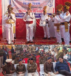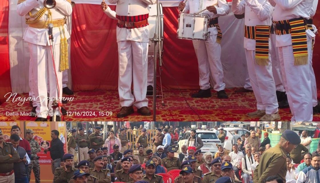 दतिया।विजय दिवस एवं मुख्यमंत्री जनकल्याण पर्व के चलते पुलिस बैंड का कार्यक्रम सोमवार को शहर के किला चौक पर आयोजित किया गया।कार्यक्रम के दौरान पुलिस बैंड दल द्वारा उत्साहपूर्वक शानदार प्रस्तुति दी गई,जिसमें पुलिसकर्मी द्वारा वाद्ययंत्रों पर देशभक्ति के धुन बजाई गई।उल्लेखनीय है कि 16 दिसंबर को भारत में विजय दिवस मनाया जाता है।इसी दिन वर्ष 1971 में भारत ने पाक के खिलाफ युद्ध में ऐतिहासिक जीत हासिल की थी।इस दौरान कार्यक्रम में कलेक्टर संदीप कुमार माकिन एवं पुलिस अधीक्षक वीरेंद्र कुमार मिश्रा, अति.पुलिस अधीक्षक सुनील कुमार शिवहरे,सहायक सेनानी ललित डांगुर,एसडीओपी दतिया प्रियंका मिश्रा,बड़ौनी विनायक शुक्ला,अजाक, थाना प्रभारी कोतवाली धीरेन्द्र मिश्रा, सूबेदार नईम खान,रक्षित निरीक्षक सौरव तिवारी, सूबेदार हौतम सिंह बघेल, महिला थाना प्रभारी मोनिका मिश्रा सहित जिले के पुलिस अधिकारी कर्मचारी सहित आमजन उपस्थित रहे।