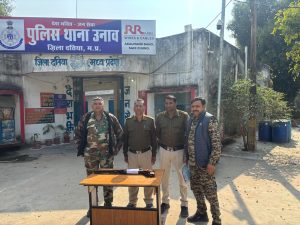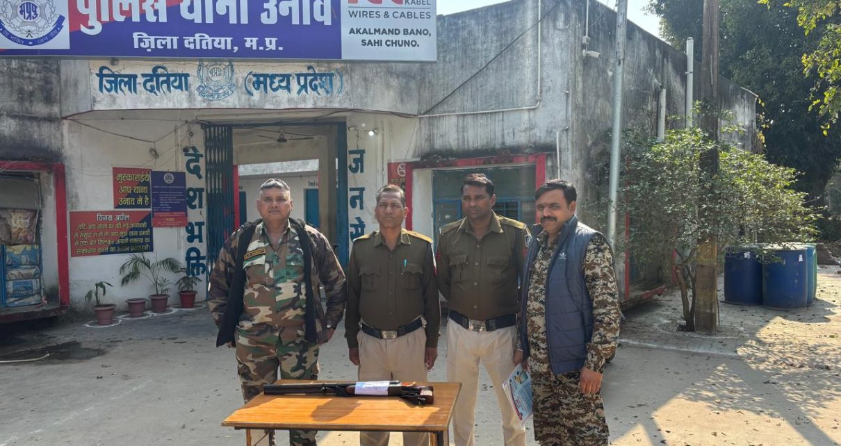 दतिया।पुलिस अधीक्षक वीरेन्द्र कुमार मिश्रा के निर्देशन में एवं अति. पुलिस अधीक्षक सुनील कुमार शिवहरे व एसडीओपी भाण्डेर कर्णिक श्रीवास्तव के मार्गदर्शन में उनाव थाना प्रभारी भास्कर शर्मा के नेतृत्व में पुलिस ने बर्थडे पार्टी में आरकेस्ट्रा कार्यक्रम में अपनी लायसेंसी बंदूक का दुरुपयोग करने वाले आरोपी को किया गिरफ्तार। दरअसल 16 जनवरी को उनाव में गिर्राज मैरिज गार्डन में मिंटू उर्फ आलोक चोबे निवासी उनाव के बच्चे की बर्थडे पार्टी में आरकेस्ट्रा कार्यक्रम में एक व्यक्ति व एक युवती बंदूक का बंदूक लहराकर अश्लील तरीके से नाचने का विडियो सोशल मीडिया पर वायरल हुआ था। जिस पर से थाना उनाव में सुसंगत धाराओं में अपराध पंजीबद्ध किया था । उनाव पुलिस व्दारा उक्त्त घटना के आरोपी सोनू उर्फ नीरज पंडा व मिंटू उर्फ आलोक चोबे नि.गण उनाव को गिरफ्तार कर बंदूक लहराकर नाचने वाली युवती के बारे में एंव घटना में प्रयोग की गई बंदूको के बारे में पूछताछ की तो बंदूके कमलेश आदिवासी नि. उनाव व धर्मेन्द्र उर्फ धर्म कमरिया नि. परासरी की होना बताया, जिससे आरोपी धर्मेन्द्र उर्फ धरु कमरिया नि. परासरी को गिरफ्तार कर उसके कब्जे से 12 बोर शार्ट बट दुनाली बन्दूक जप्त की गई है। एवं आरोपीगण धर्मेंद्र उर्फ़ धर्म कमरिया, कमलेश आदिवासी के शस्त्र लाइसेंस निलंबन् हेतु पत्र जिला दण्डाधिकारी के यहाँ पूर्व में ही भेजा जा चुका है।उक्त संपूर्ण कार्यवाही में थाना प्रभारी उनाव श्री भास्कर शर्मा, प्रआर. मनोज अम्ब, आर.धर्मेन्द्र राजावत, आर धर्मेन्द्र प्रजापति की सराहनीय भूमिका रही।