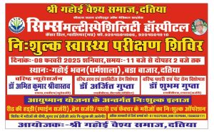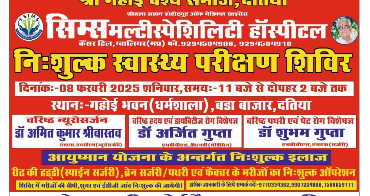 दतिया।दतिया में निःशुल्क मल्टीस्पेशिलिटी द्वारा स्वास्थ्य शिविर 8 फ़रवरी गहोई धर्मशाला में होगा आयोजित,गौरतलब है कि निःशुल्क मल्टीस्पेशिलिटी स्वास्थ्य शिविर 8 फ़रवरी को गहोई वैश्य समाज दतिया एवं सिम्स मल्टीस्पेशिलिटी हॉस्पिटल ग्वालियर के सहयोग से निशुल्क मल्टीस्पेशिलिटी स्वास्थ्य शिविर गहोई भवन(धर्मशाला) बड़ा बाजार दतिया में 8 फ़रवरी को दिन शनिवार को प्रातः 11 बजे से दोपहर 2 बजे तक लगाया जायेगा l शिविर में सिम्स हॉस्पिटल ग्वालियर के वरिष्ठ न्यूरोसर्जन डॉ अमित कुमार श्रीवास्तव, वरिष्ठ हृदय एवं डायबिटीज रोग डॉ अर्जित गुप्ता एवं पथरी व पेट रोग विशेषज्ञ डॉ शुभम गुप्ता के द्वारा मरीजों का निःशुल्क परीक्षण कर उचित परामर्श दिया जायेगा वसम्बंधित जांचें ब्लडशुगर,ब्लडप्रेशर व ईसीजी इत्यादि निःशुल्क की जायेंगी lशिविर सम्बंधित अधिक जानकारी देते हुए हॉस्पिटल संचालक डॉ नीरज शर्मा ने बताया की शिविर से इलाज हेतु चयनित मरीज स्पाइन सर्जरी, ब्रेन सर्जरी, पथरी के ऑपरेशन, समस्त फेक्चर के ऑपरेशन इत्यादि आयुष्मान योजना के अंतर्गत सिम्स हॉस्पिटल, ग्वालियर में निःशुल्क किये जायेंगे।