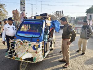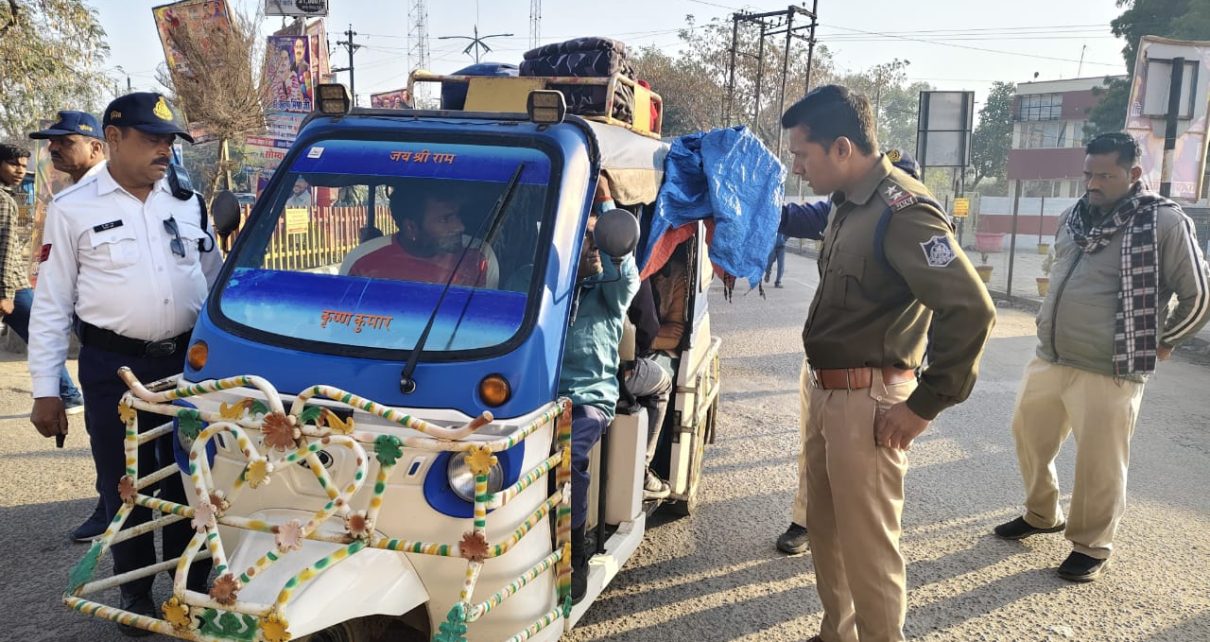 दतिया।जिला न्यायालय की विधिक सेवा प्राधिकरण लोक अदालत के निर्देश पर यातायात पुलिस ने की कार्रवाई।दतिया पुलिस अधीक्षक वीरेन्द्र कुमार मिश्रा के निर्देशन एवं अतिरिक्त पुलिस अधीक्षक सुनील कुमार शिवहरे के मार्गदर्शन एवं अनुविभागीय अधिकारी पुलिस दतिया के कुशल नेतृत्व में यातायात प्रभारी सूबेदार नईम खान ने मंगलवार को शहर के मुख्य मार्गों झांसी चुंगी, राजगढ़ चौराहा, कलापुरम चौराहा, सीता सागर बायपास पर यातायात पुलिस बल के साथ आकस्मिक चेकिंग के दौरान 35 से अधिक वाहनों को चेक किया एवं ओवर लोड सवारी एवं दस्तावेज न होने पर ऑटो, ओमनी, इको कार, बस, मैजिक वाहन को जप्त कर थाना परिसर में रखा गया जिनके विरुद्ध शासन के निर्देशानुसार अग्रिम कार्यवाही की जावेगी।चेकिंग के दौरान प्राथमिक उपचार किट, अग्निशमन यंत्र, वाहनों के दरवाजे, दस्तावेज, चालक का लाइसेंस, ओवर लोड सवारी न होना आदि चेक किए।बस चालकों एवं ऑटो चालकों को सुप्रीम कोर्ट की गाइडलाइन के 18 बिंदु एवं यातायात नियमों का पालन करने को कहा गया।यातायात पुलिस का सभी स्कूल बस चालको एवं ऑटो चालकों से अपील कि, वह बच्चों को वाहन में ओवरलोड परिवहन न करें। यातायात पुलिस दतिया द्वारा निरन्तर चेकिंग कर नियमों का पालन नहीं करने पर सख्त कार्यवाही की जाएगी।कार्यवाही के दौरान–यातायात प्रभारी सूबेदार नईम खान,प्रधान आरक्षक रवींद्र यादव, आर. संजीव,आर. विनोद, आर. अशोक,आर. चालक दिनेश, आर.चालक पदम एवं हमराह फोर्स मौजूद रहा।