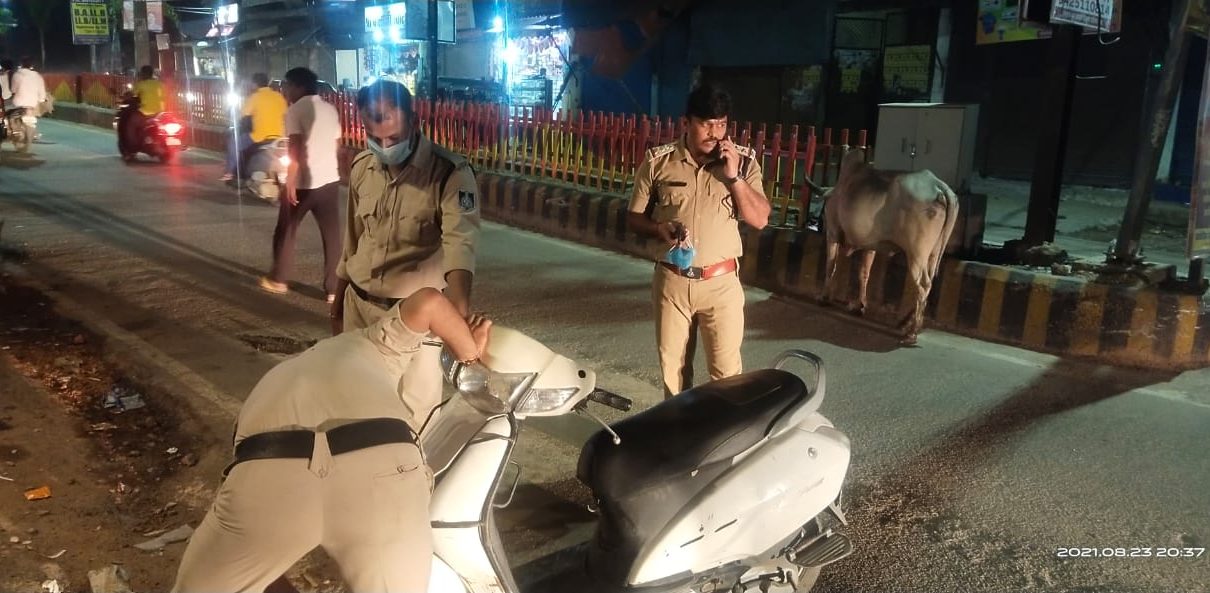 इस दौरान टीआई श्री शर्मा ने दुकानों के बाहर सड़क पर खड़ी बाइकों की हवा निकाली।