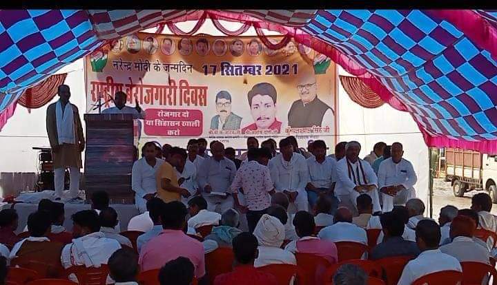 इंदरगढ़ के ग्वालियर तिराहे पर कांग्रेस द्वारा युवा बेरोजगार धरना प्रदर्शन किया गया केंद्र एवं राज्य सरकार पर बेरोजगारी को लेकर आरोप लगाए गए कार्यक्रम में पूर्व लोकसभा प्रत्याशी देबाशीष जरारिया, सेवडा विधायक घनश्याम सिंह, कांग्रेस जिला अध्यक्ष अशोक दांगी, रामकिंकर सिंह गुर्जर, धीरेंद्र सिंह राठौर सहित वरिष्ठ कांग्रेसी नेता कार्यकर्ता उपस्थित रहे।