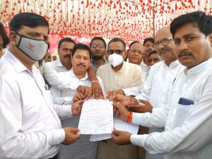 धरना प्रदर्शन के बाद महामहिम राज्यपाल के नाम नायब तहसीलदार नरेंद्र यादव को 10 मांगो के लिए ज्ञापन सौंपा।