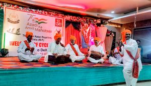 आजादी का अमृत महोत्सव कार्यक्रम के तहत सशस्त्र सीमा बल भोपाल से साइकिल रैली दतिया पहुंची जिसका दतिया पहुंचने पर होटल रतन रॉयल में भव्य स्वागत और सम्मान किया गया इस अवसर पर सैनिकों के सम्मान में विराट कवि सम्मेलन एवं सांस्कृतिक कार्यक्रम का आयोजन किया गया जिसमें शारदा हाई स्कूल के बच्चों द्वारा देशभक्ति के गीतों पर शानदार सांस्कृतिक प्रस्तुति दी गई वही बुंदेलखंड की लोकगीत परंपरा के तहत नारायण कुशवाहा मंडली द्वारा देशभक्ति पर आधारित लोक गीतों की शानदार प्रस्तुति दी गई और कवि सम्मेलन में भी कवियों ने शानदार काव्य पाठ कर देशभक्ति पर आधारित कविताएं प्रस्तुत कर सैनिकों को बार बार ताली बजाने के लिए मजबूर कर दिया कवि सम्मेलन की अध्यक्षता डॉ आरपी गुप्ता ने की अन्य कवियों में विनोद मिश्रा अरुण कुमार सिद्ध गुरु राजेंद्र सिंह खेगर आकांक्षा रावत शुगर सिंह आदि थे कार्यक्रम में मुख्य अतिथि के रुप में दतिया के शहीद सैनिक रामजी मिश्रा की धर्मपत्नी श्रीमती प्रभा मिश्रा जी उपस्थित रहे कार्यक्रम की अध्यक्षता सशस्त्र सीमा बल के महा निरीक्षक राजेंद्र कुमार भूमला ने की जबकि कार्यक्रम का संचालन अनूप गोस्वामी ने किया इस अवसर पर सशस्त्र सीमा बल के आईजी द्वारा श्रीमती प्रभा शर्मा ,डॉ आरपी गुप्ता, विनोद मिश्रा, संजय रावत, राजेंद्र सिंह खेगर, अरुण सद्गुरु, शुगर सिंह, जितेंद्र गौतम, मीना श्रीवास्तव, मधु पटेरिया, अनूप गोस्वामी, अमित महाजन, नारायण सिंह कुशवाह, सुनील सिंह कुशवाहा, को सम्मानित किया इस अवसर पर आईजी राजेंद्र कुमार ने कहा कि आज हम अपनी आजादी की 75 वीं वर्षगांठ बहुत धूमधाम से मना रहे हैं हम सभी को आजादी का महत्व समझना होगा हम सभी को अपने देश के लिए कुछ ना कुछ योगदान देना है इसलिए देश हित में सोचो और कार्य करें आज हमारा भारत देश पूरे विश्व में अपना एक महत्वपूर्ण स्थान बना रहा है और विश्व के सभी देश भारत के शक्ति को समझते हुए हमारे देश को महत्व दे रहे हैं हमें भी अपनी देश के लिए योगदान देना है और अपनी आजादी का महत्व समझना है अंत में आभार व्यक्त कार्यक्रम के संयोजक सुनील शर्मा ने किया इस अवसर पर साहित्य प्रेमी साहित्य शस्त्र बल के सैनिक एवं गणमान्य नागरिक आदि लोग उपस्थित थे