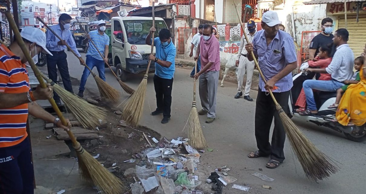 कलेक्टर श्री संजय कुमार के नेतृत्व में आज सुबह प्रातः 6:00 से अधिकारियों एवंकर्मचारियों तथा समाजसेवियों ने हाथों में झाड़ू थाम कर टाउन हॉल से सफाई कार्य शुरू किया। जो किला चौक पर गांधी पार्क के पाससमाप्त हुआ। गांधी पार्क में महात्मा गांधी की प्रतिमा पर कलेक्टर सहित अधिकारियों एवंसमाजसेवियों आदि ने माल्यार्पण कर उन्हें नमन कर उनके सिद्धांतों पर चलने की प्रेरणा ली ।कलेक्टर ने इस मौके पर उपस्थित जनों को नगर को साफ सुथरा रखने नशा न करने की शपथ भी दिलाई। इस दौरान जिला पंचायत के मुख्य कार्यपालन अधिकारी श्री कमलेश भार्गव सहित अधिकारी एवं समाजसेवी तथा हास्य क्लब के पदाधिकारी गण भी उपस्थित थे।