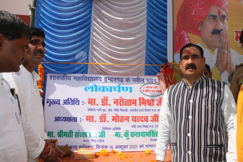 दतिया। गृह मंत्री डॉ. नरोत्तम मिश्रा ने शनिवार को इन्दरगढ़ तहसील में पहुंचकर मुख्य अतिथि के रूप में शासकीय महाविद्यालय पीजी कॉलेज की सौगात दी। शासकीय महाविद्यालय पीजी कॉलेज की नवनिर्मित भवन 6 करोड़ 50 लाख रूपये की लागत से बनकर तैयार हुआ है। जिसमें छात्र-छात्राओं को सर्वसुविधा उपलब्ध रहेगी।कार्यक्रम के दैरान वर्चुअल से उच्च शिक्षा मंत्री मोहन यादव ने संबोधित कर शासकीय महाविद्यालय पीजी कॉलेज बन जाने पर बधाई देते हुए कहा कि तहसील इन्दरगढ़ में लंबे समय से पीजी कॉलेज की मांग आ रही थी। क्योकि तहसील के आस-पास छात्र-छात्राओं के लिए कॉलेज न होने पर बहुत परेशानी होती थी। जो अब नहीं होगी। उन्होंने कहा कि हमारी सरकार हर क्षेत्र में विकास करना चाहती है जिससे हर व्यक्ति को अंतिम छोर तक लाभ मिल सके।