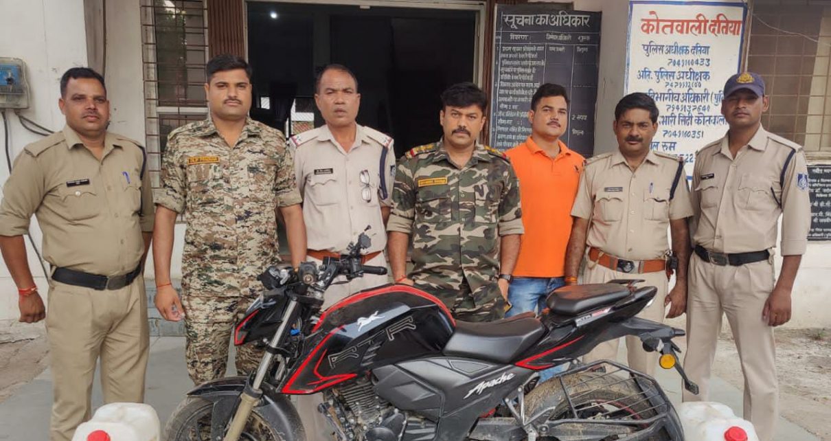 *श्रीमान पुलिस अधीक्षक महोदय श्री अमन सिंह राठौर जी अतिरिक्त पुलिस अधीक्षक महोदय श्री कमल सिंह मोर्य जी एसडीओपी दतिया श्री सुमित अग्रवाल जी* के निर्देशन में अपराध व अपराधियों पर अंकुश लगाने के तहत चलाए जा रहे अभियान के अंतर्गत आज दिनांक को मुखबिर की सूचना पर थाना कोतवाली पुलिस द्वारा एक बिना नंबर की अपाचे मोटरसाइकिल सहित दो आरोपियों को 30 -30 लीटर की प्लास्टिक की केनो में अवैध देसी शराब ले जाते हुये पोल फैक्टरी निचरोली रोड से पकड़ा गया