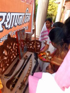 राष्ट्र सेविका समिति डबरा द्वारा हिंदू समाज में प्रचलित राष्ट्र सेविका समिति के 6 महत्वपूर्ण उत्सवों में से एक उत्सव शस्त्र पूजन कार्यक्रम के आयोजन में राष्ट्र सेविका समिति की प्रस्तावना श्रीमती अंजू भार्गव ने रखी कार्यक्रम में मुख्य वक्ता के रूप में श्रीमती विनीता गुप्ता ने कहा कि हिंदू समाज में अनादि काल से शस्त्र रखने और शस्त्र के पूजन की प्रथा चली आ रही है यहां तक की हिंदू समाज के हमारे सारे देवी देवता दो ,तीन प्रकार के शस्त्रों को धारण करते हैं यह हमारी परंपरा का सौर्य एवं तेज प्रतीक है समय-समय पर धर्म की रक्षा ,मानवता की रक्षा एवं विधर्मी लोगों के अत्याचार से धर्म परायण लोगों के रक्षा हेतु पुरातन काल से शस्त्र रखना, शस्त्र चलाना एवं शस्त्र पूजन की परंपरा चली आ रही है आगे आने वाली हमारी पीढ़ी को यह परंपरा के प्रति दृढ़ विश्वास बना रहे उसे कायम रखने हेतु हम सब ऐसे अवसरों का आयोजन करते हैं कार्यक्रम के प्रारंभ में श्रीमती जूही गुप्ता मैं गीत लिया।