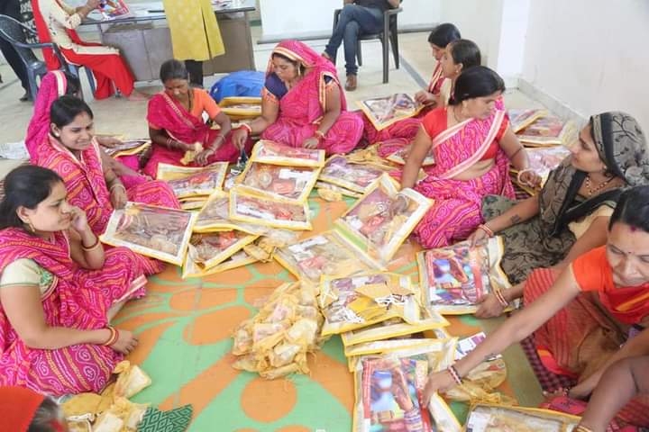 समूह की महिलाओं द्वारा आगामी “करवा चौथ” व्रत को ध्यान में रखते हुए स्वनिर्मित जरी की साड़ियों, ज्वेलरी और सौंदर्य सामग्री का एक गिफ्ट हैंपर “संस्कार” नाम से बाजार में लाया गया है ।
