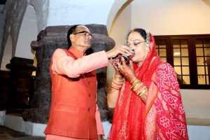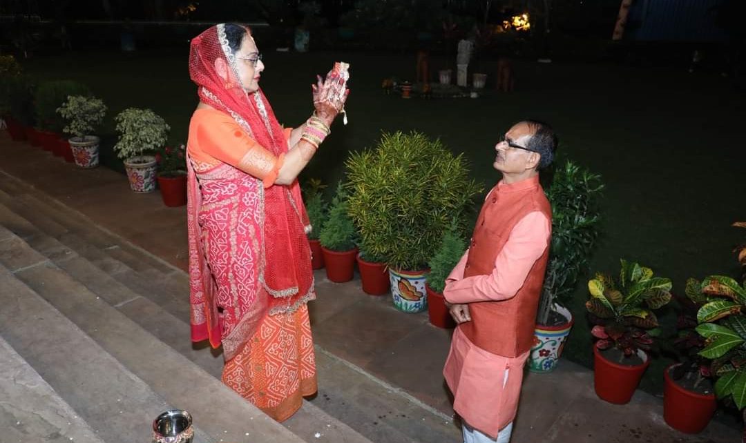 मुख्यमंत्री श्री Shivraj Singh Chouhan ने अपनी धर्मपत्नी श्रीमती साधना सिंह चौहान के साथ निवास पर करवा चौथ का पर्व मनाया। श्रीमती साधना सिंह ने चंद्रोदय के बाद चंद्रमा को अर्ध्य देकर पूजा की तथा परंपरा अनुसार छलनी के माध्यम से चंद्रमा और पति श्री चौहान के दर्शन कर आशीर्वाद प्राप्त किया। मुख्यमंत्री श्री चौहान ने पत्नी श्रीमती साधना सिंह को जल ग्रहण करवाकर व्रत का पारण करवाया और पति-पत्नी ने विधि-विधान से पूजा की। करवा चौथ का व्रत पति की लम्बी और कष्ट रहित पूर्ण आयु की प्राप्ति के लिए रखा जाता है।