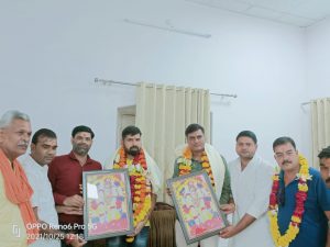 साथ ही युवा मोर्चा प्रदेश पदाधिकारी *अतुल भूरे चौधरी, विक्रम सिंह यादव व अमरीश गुप्ता* ने फूल माला पहनाकर एवं पीतांबरा माई की तस्वीर *भेंट कर किया स्वागत।*