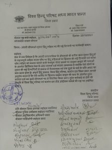 डबरा हिंदू महिलाओं के सर्वश्रेष्ठ त्यौहार करवा चौथ पर आखिरी नगर पालिका सीएमओ श्री शारिब खान द्वारा हिंदुओं के महत्वपूर्ण एवं सर्वश्रेष्ठ त्योहार करवा चौथ पर हिंदू महिलाओं के खिलाफ फेसबुक पर की गई अभद्र टिप्पणी एवं करवा चौथ पर विशिष्ट महिलाओं का त्यौहार को लेकर आतरी नगर पालिका सीएमओ के द्वारा अभद्र टिप्पणी की गई है इसी को लेकर डबरा बजरंग दल एवं विश्व हिंदू परिषद ने संपूर्ण हिंदू समाज में त्योहारों को लेकर सीएमओ ने फेसबुक पर अवध टिप्पणी को लेकर मुख्यमंत्री के नाम डबरा में ज्ञापन सौंपा और विश्व हिंदू परिषद एवं बजरंग दल द्वारा बताया गया है कि श्री शारिब खान को तत्काल आतरी नगरपालिका पद से तुरंत निलंबित किया जाए एवं सोशल मीडिया फेसबुक पर अभद्र टिप्पणी की है जिसके अंतर्गत सोशल मीडिया साइबर क्राइम की धारा के अंतर्गत मामला पंजीबद्ध किया जाए अगर ऐसा नहीं होता है तो विश्व हिंदू परिषद एवं बजरंग दल तीव्र गति से पूरे मध्यप्रदेश में आंदोलन चलाएगा