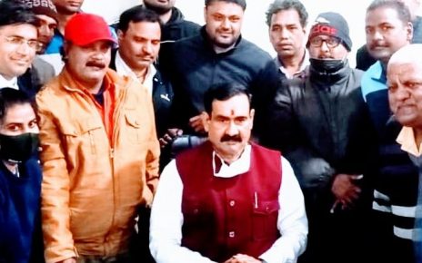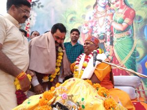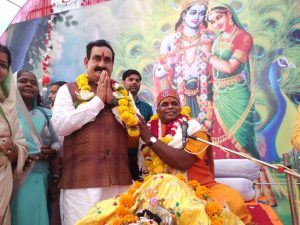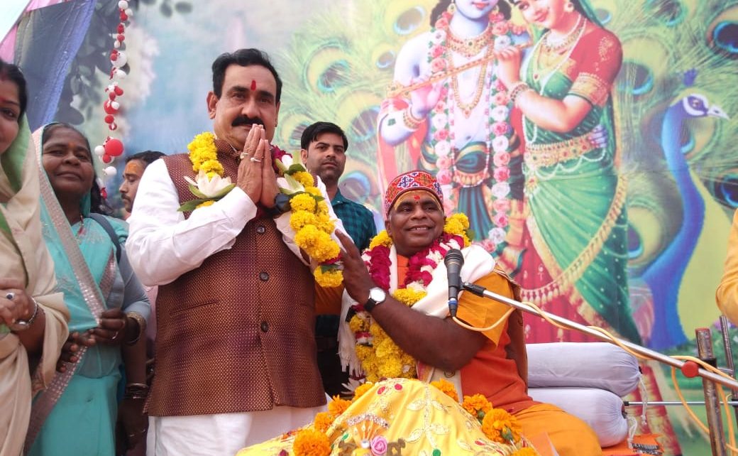 *गृह मंत्री डॉ नरोत्तम मिश्रा पहुंचे राजघाट कॉलोनी में हो रही भागवत कथा में* कथावाचक महाराज को साल श्रीफल और पुष्प माला पहनाकर किया सम्मान चरण छू कर लिया आशीर्वाद साथी