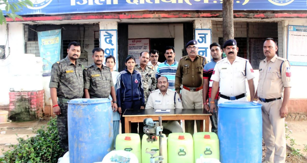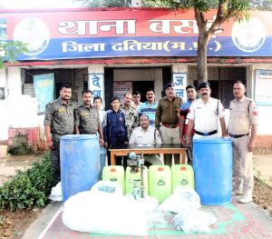 श्रीमान पुलिस अधीक्षक महोदय जिला दतिया श्री अमन सिंह राठौर द्वारा दिए गए निर्देशों के पालन में श्रीमान अतिरिक्त पुलिस अधीक्षक महोदय श्री कमल मौर्य एवं एसडीओपी महोदय अनुभाग बडौनी श्री दीपक नायक के कुशल मार्गदर्शन में दिनांक 02/11/2021 को दौराने इलाका भ्रमण जरिए मुखबिर सूचना मिली कि प्रान सिंह पुत्र दशरथ लोधी निवासी मनगुली एवं शालिगराम पुत्र वृंदावन लोधी निवासी मड़ैया पुरवा मुडरा के शालिगराम के घर के पीछे लाइट के उजाले में अवैध ओपी शराब से शराब बनाकर बेचने के लिए पैकिंग कर रहे हैं सूचना की तस्दीक हेतु मय फोर्स व साक्षी गणों को मुखबिर की सूचना से अवगत कराकर साथ लेकर मुखबिर के बताए स्थान मडैया पुरवा मुडरा सालिगराम लोधी के घर के पास पहुंचा देखा तो सालिगराम व प्रान सिंह ओपी शराब से अवैध शराब की पैकिंग क्वार्टरों में मशीन से कर रहे थे जो पुलिस की आमद रफत पाकर पीछे खेतों में जंगल में भाग गए मौके पर से 2 ड्रम जिनमें करीब 200 – 200 लीटर ओपी शराब कीमती करीब ₹480000 एवं चार कट्टी (केन) प्लास्टिक की प्रत्येक में करीब 50 – 50 लीटर शराब कीमती करीब ₹240000 एवं दो प्लास्टिक के कट्टों में 100-100 क्वार्टर कीमती करीब ₹12000 जिनमें देसी शराब भरी हुई मिली एवं एक लोहे की शराब पैकिंग मशीन कीमती करीब ₹20000 व 200 क्वार्टर खाली व 200 ढक्कन एवं एक शराब मापने का मीटर मिला कुल कीमती ₹750000 विधिवत पंचान जप्त की गई एवं मौके से आरोपी प्रान सिंह पुत्र दशरथ लोधी निवासी मनगुली थाना पिछोर एवं आरोपी शालिगराम पुत्र वृंदावन लोधी निवासी मुडरा के मौके से फरार हो गए उक्त कार्यवाही करने में थाना प्रभारी बसई SO रामसेवक शर्मा , सहायक उप निरीक्षक प्रवीण कुमार बरुआ ,कार्यवाहक प्रधान आरक्षक 204 नीरज शर्मा, कार्यवाहक प्रधान आरक्षक 76 रामप्रकाश यादव ,आरक्षक 401 लक्ष्मी नारायण मिश्रा ,आरक्षक 281 संदीप तिवारी ,आरक्षक 637 भगवती प्रसाद शर्मा का कार्य सराहनीय रहा।