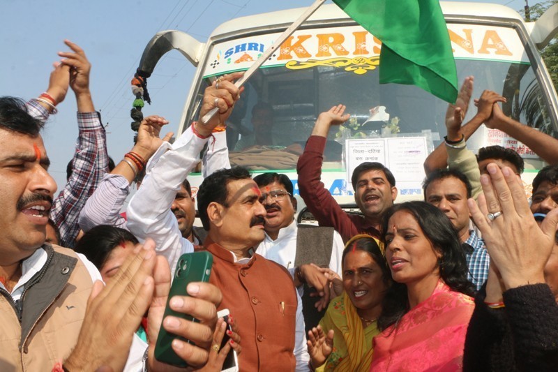 गृह मंत्री ने जनजातीय गौरव दिवस के कार्यक्रम मे जाने वाले लोगों को 30 बसों के माध्यम से बस को हरी झंडी दिखाकर रवाना किया,