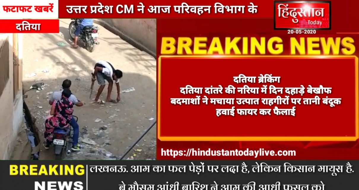 दतिया दांतरे की नरिया में दिन दहाड़े बेखौफ बदमाशों ने मचाया उत्पात। राहगीरों पर तानी बंदूक। हवाई फायर कर फैलाई दहशत। कोतवाली क्षेत्र का मामला। वायरल वीडियो में अवैध हथियार लिए राहगीरों को हड़काते नजर आ रहे बाइक सवार हथियार बंद बदमाश। लॉक डाउन में पुलिस के लिए सर दर्द बने बदमाश। कोतवाली पुलिस ने इमरान उर्फ इम्मू खान एंव राम पाठक के खिलाफ दर्ज किया मामला।
