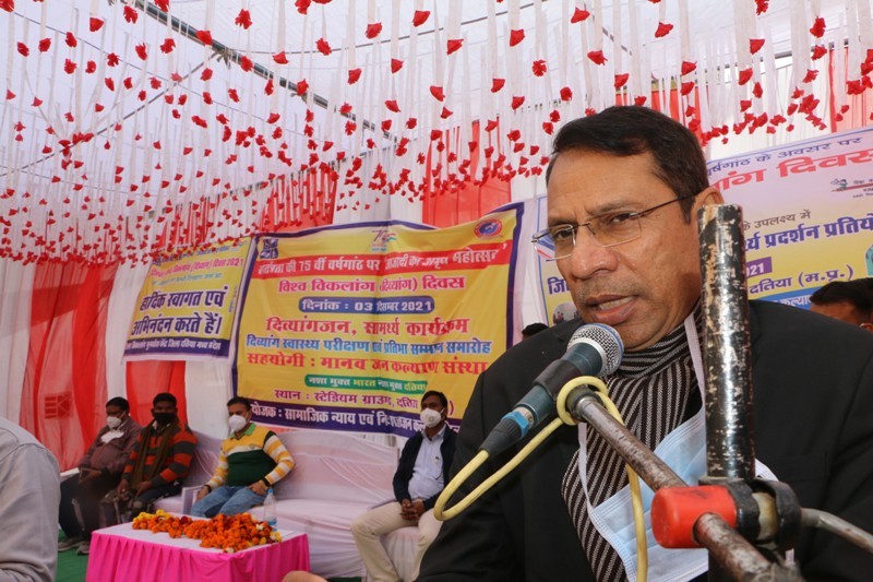 दतिया। कलेक्टर संजय कुमार ने कहा कि दिव्यांग समाज का महत्वपूर्ण अंग है। दिव्यांगों ने कई क्षेत्रों में सामान्य व्यक्तियों से बेहतर प्रदर्शन किया है। हम सबका दायित्व है कि दिव्यांगों को अपनी प्रतिभा का प्रदर्शन करने का पूरा अवसर दें। इस मौके पर दिव्यांगजनों द्वारा उत्पादित सामग्री के स्टॉलों का भी निरीक्षण कर दिव्यांगों के हुनर की सराहना की गई। कलेकटर श्री कुमार शुक्रवार को आजादी की 75 वर्षगांठ अमृत महोत्सव के तहत् स्टेड़ियम दतिया में विश्व दिव्यांग दिवस के अवसर पर सामाजिक न्याय एवं जिला विकलांग पुर्नवास केन्द्र दतिया द्वारा दिव्यांगों के लिए जिला स्तरीय खेलकूद एवं सार्मथ्य प्रदर्शन प्रतियोगिता के शुभारंभ कार्यक्रम को संबोधित कर रहे थे। कार्यक्रम में जिला पंचायत के मुख्य कार्यपालन अधिकारी श्री कमलेश भार्गव, डॉ. एसएन शाक्य, डॉ. बीके वर्मा, डॉ. हेमंत गौतम, डॉ. दिनेश माटेली, डॉ. अरविन्द गौरव, डीपीसी श्री राजेश पैंकरा आदि उपस्थित थे।
