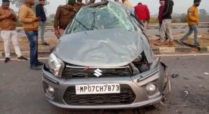 सड़क हादसा : अनियंत्रित कार डिवाडर से टकराकर पलटी, एक मौत, चार लोग घायल