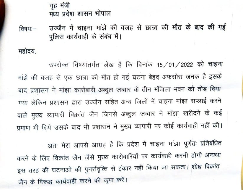 उपरोक्त विषयांतर्गत लेख है कि दिनांक 15/01/2022 को चाइना मांझे की वजह से एक छात्रा की मौत हो गई घटना बेहद अफसोस जनक है इसके बाद प्रशासन ने मांझा कारोबारी अब्दुल जब्बार के तीन मंजिला भवन को तोड़ दिया गया लेकिन प्रशासन द्वारा उज्जैन सहित अन्य जिलों मंे चाइना मांझा सप्लाई करने वाले मुख्य व्यापारी विक्रांत जैन जिनसे अब्दुल जब्बार ने मांझा खरीदने के कईं प्रमाण भी दिये उसके बाद भी प्रशासन ने मुख्य व्यापारी पर कोई कार्यवाही नहीं की।