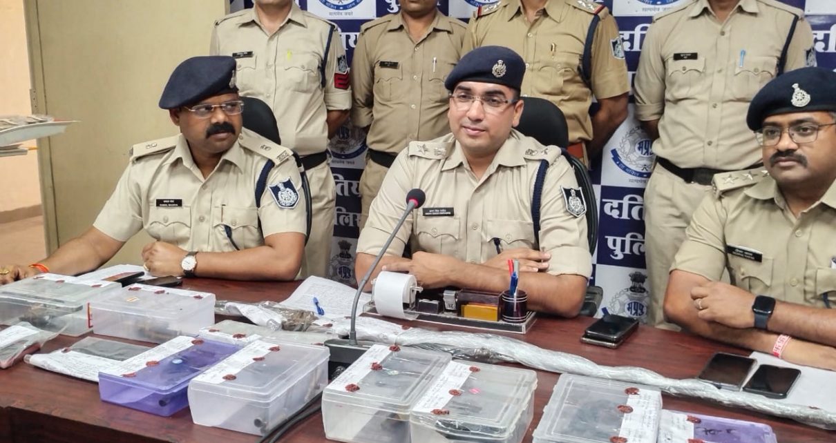 दतिया।गोपालपुरा तिराहे से पकड़े गए 2 हथियार बंद बदमाशों की निशानदेही पर 11 अवैध हथियार, 10 जिंदा कारतूस और एक मोटर साइकिल बरामद कर पकड़े गए बदमाश आदर्श यादव और दीपक उर्फ करीला यादव ने जान से मारने की नियत से धर्मेन्द्र यादव को मारी थी गोली। पुलिस कंट्रोल रुम में एसपी अमन सिंह राठौड़ ने प्रेस कॉन्फ्रेंस कर घटना का खुलासा किया। अतिरिक्त पुलिस अधीक्षक कमल मौर्य एसडीओपी दीपक नायक के मार्गदर्शन में सूक्ष्मता से विवेचना एवं विश्वसनीय सूत्रों से पता चला कि घटना आदर्श यादव पुत्र विनय यादव निवासी बडोनी दीपक उर्फ करीला यादव पुत्र स्रूरप यादव निवासी बडोनी के द्वारा गठित की गई है प्रकरण की गंभीरता को समझते हुए वरिष्ठ अधिकारियों के निर्देशानुसार आदर्श यादव और दीपक उर्फ करीला यादव की लगातार तलाश की जा रही थी कल दिनांक 28 l3l 2022 को मुखबिर तंत्र व से सूचना मिलते ही गोपालपुरा तिराहे के पास से घेराबंदी कर पकड़ा पूछताछ करने पर जुर्म करना स्वीकार किया जिन पर धारा 27 साक्ष्य अधिनियम के तहत मेमो लेख पर आरोपी दीपक करीला यादव की निशानदेही से आरोपी के घर कस्बा बडोनी एक देसी कट्टा 315 बोर एक जिंदा रावण तथा एक खाली खोखा मोबाइल जप्त किया गया आरोपी आदर्श यादव की निशानदेही से उसके घर से एक सिंगल शॉट बंदूक 315 बोर की अधिया 6 देसी कट्टा 32 बोर की दो रिवाल्वर 315 बोर के चार जिंदा राऊड 32 बोर के जिंदा राउंड 1 बुलेट मोटरसाइकिल एक मोबाइल विधिवत जप किया गया आरोपी प्रकरण में विधिवत गिरफ्तारी की गई इनकी रही भूमिका कार्रवाई में थाना प्रभारी शैलेंद्र गुर्जर उपनिरीक्षक बंदना शाक्य ,राजेंद्रें सिंह पुटठा राम सिंह राजू गुर्जर हेमंत सिंह सूरज यादव भूपेंद्र सिंह की एवं भूमिका रही। वही बड़ौनी थाना प्रभारी शैलेंद्र सिंह गुर्जर की कार्यवाही की प्रशंशा की।पुलिस अधीक्षक द्वारा बड़ौनी पुलिस को 20 हजार का इनाम की घोषणा की।