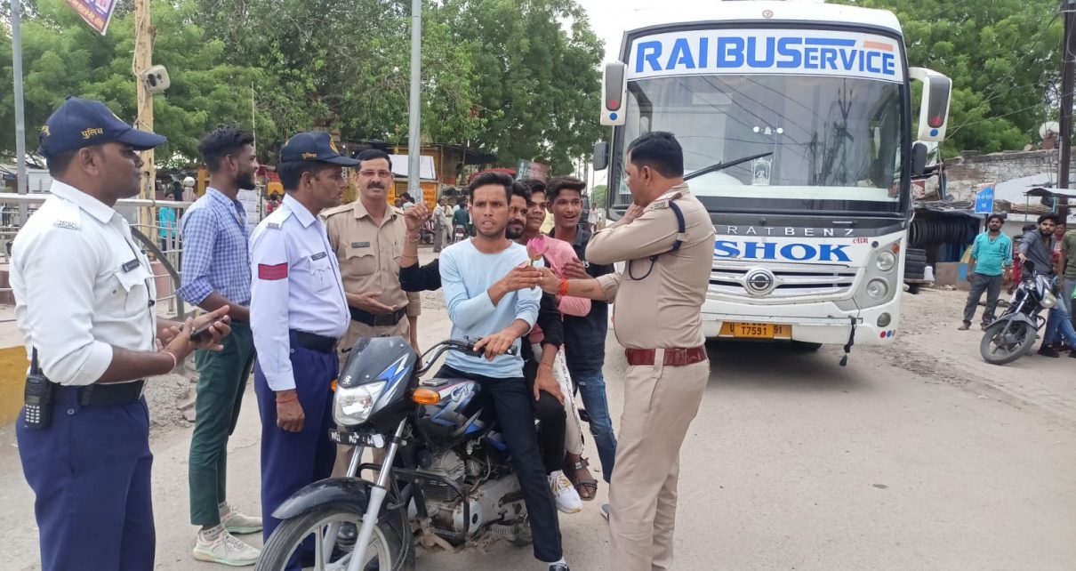 यातायात पुलिस की अनोखी पहल, मां पीतांबरा मंदिर आने वाले दर्शनार्थियों यातायात नियमों का पालन करने वाले वाहन चालकों को पुलिस ने गुलाब का फूल देकर किया सम्मानित