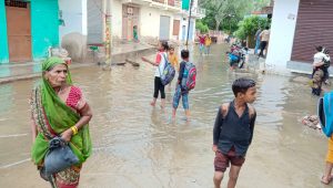 भितरवार। नगर पंचायत क्षेत्र के वार्ड क्रमांक 10 संकट मोचन हनुमान मंदिर एवं शासकीय उत्कृष्ट बालिका छात्रावास की ओर जाने वाले आम रास्ते के अलावा रहने वाले लोगों के घरों में बुधवार को एक बार फिर लगभग 1 घंटे तक हुई झमाझम बारिश के दौरान बाढ़ जैसे हालात नजर आए। क्योंकि चारों ओर गलियों में और घरों में पानी ही पानी नजर आया इस दौरान रह वासियों के घरों के अंदर पानी भर जाने से लोगों के घर की गृहस्थी का सामान भी पानी से भीग कर खराब हो गया। तो वही स्कूली बच्चों को घुटने तक सड़कों पर भरे पानी के बीच घर पहुंचना पड़ा इस दौरान कई छोटे-छोटे बच्चों को पानी भर जाने के कारण उनके अभिभावक उन्हें लेने स्कूल पहुंचे और कठिन परिश्रम के साथ होने पानी से लेकर घर पहुंचे।