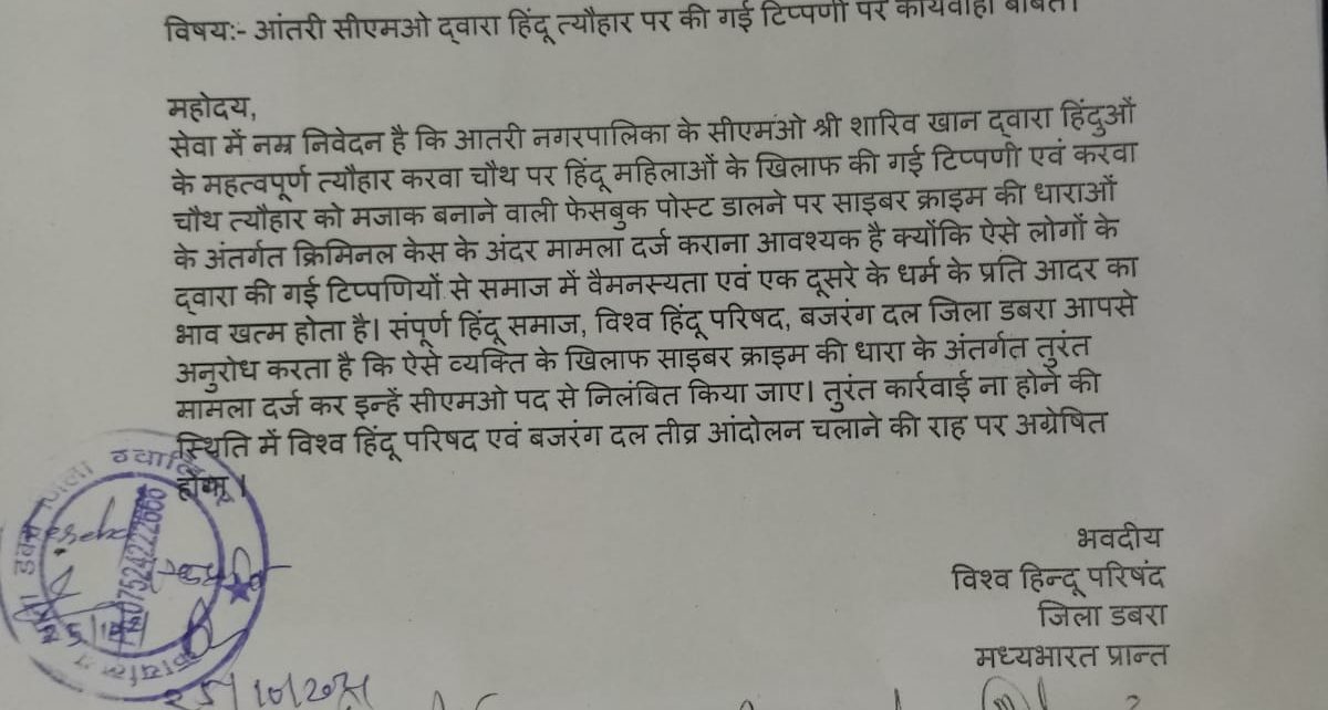 नगर पालिका परिषद के सीएमओ द्वारा करवा चौथ पर फेसबुक पर की गई अभद्र टिप्पणी …………………………………….. डबरा हिंदू महिलाओं के सर्वश्रेष्ठ त्यौहार करवा चौथ पर आखिरी नगर पालिका सीएमओ श्री शारिब खान द्वारा हिंदुओं के महत्वपूर्ण एवं सर्वश्रेष्ठ त्योहार करवा चौथ पर हिंदू महिलाओं के खिलाफ फेसबुक पर की गई अभद्र टिप्पणी एवं करवा चौथ […]